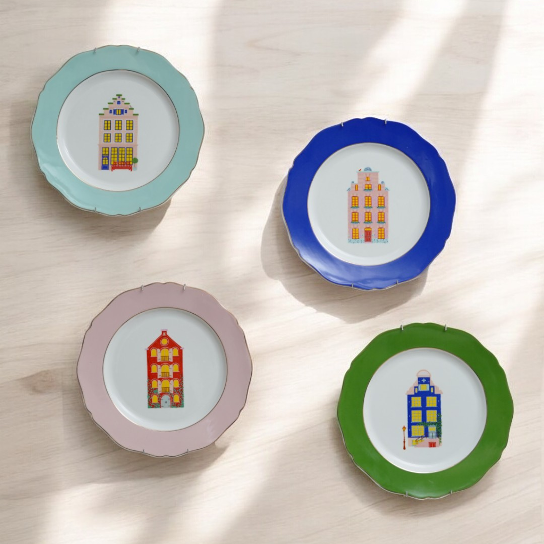 Vibrant porcelain plates featuring whimsical depictions of traditional Dutch houses. Available in shades of blue, green, pink, and mint, these colorful plates adds a lively touch to any room. Perfect for creating a unique and charming display, the Holland Hues Wall Plates brings the spirit of the Netherlands to your home decor. Mix and match to create your own vibrant cityscape on your walls!