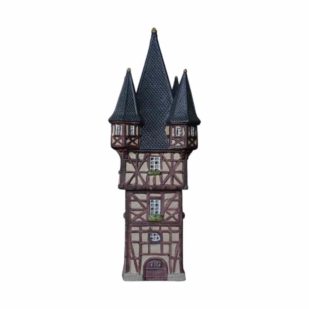 Step into the storied realm of Brömserburg with this intricately hand-painted miniature tower. A piece of history on your shelf, this German architectural marvel adds a touch of medieval charm to any room. Perfect for collectors and enthusiasts of European heritage.