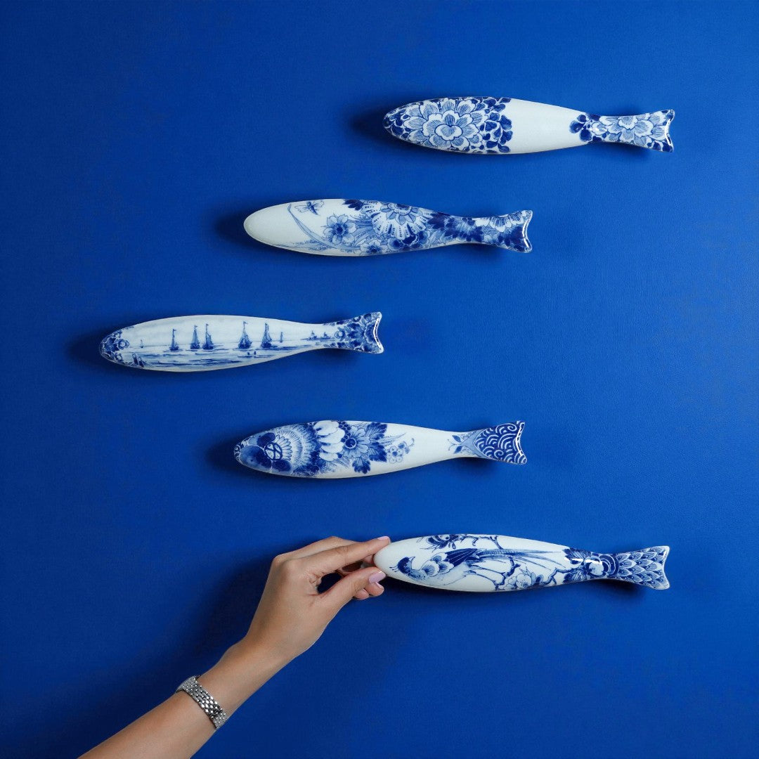 Each handcrafted porcelain herring (24 cm) tells its own story through intricate blue and white patterns. From the serene maritime landscapes of Mesdag's Fleet to the bold geometry of Art Deco, the delicate Flower Scales pattern, the lush Flower Bed design, and the majestic Peacock Scales—together they create a dynamic wall display that's both whimsical and sophisticated.